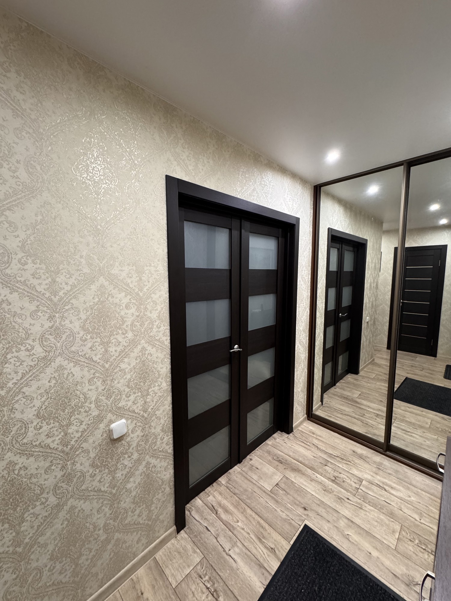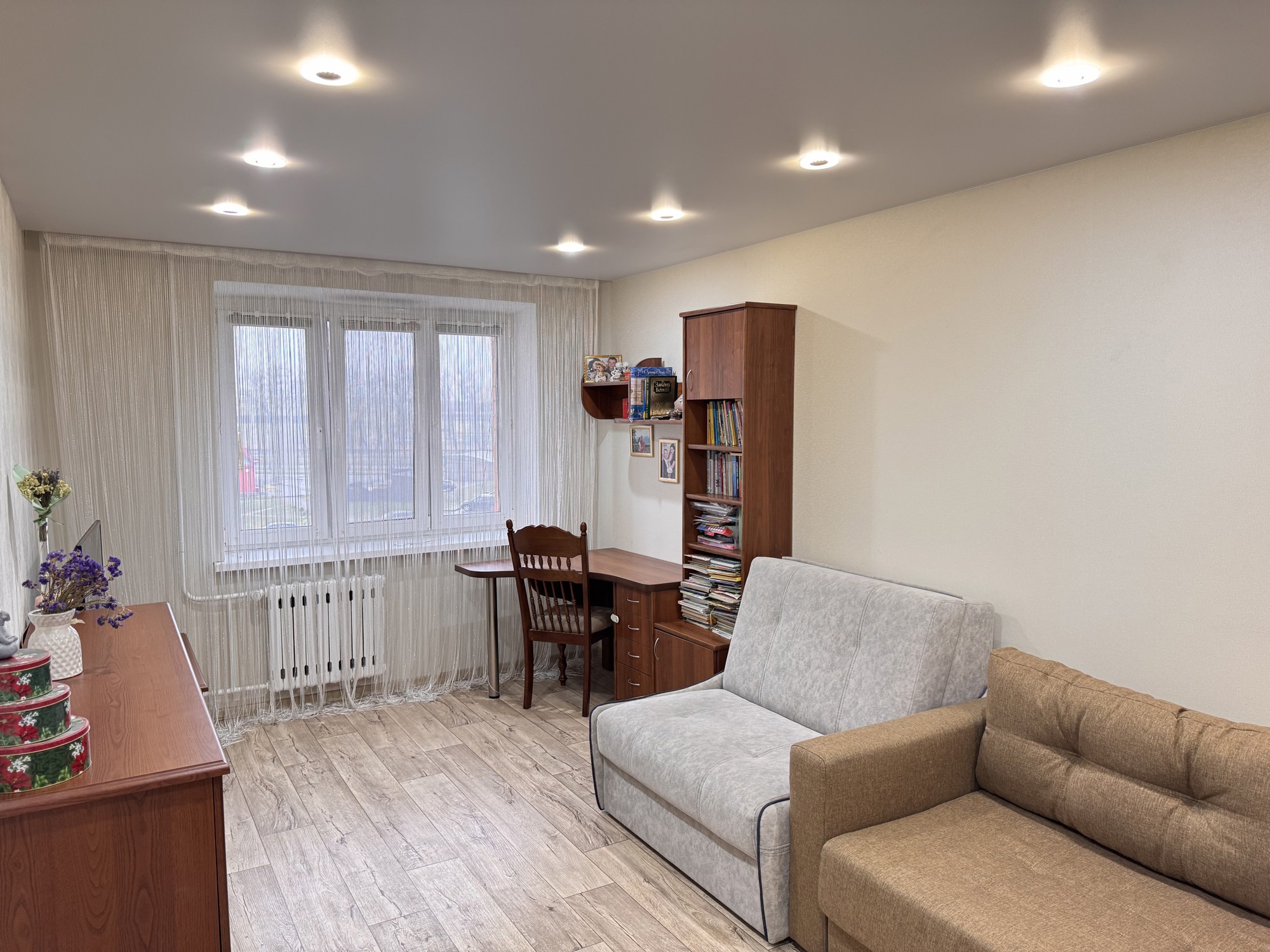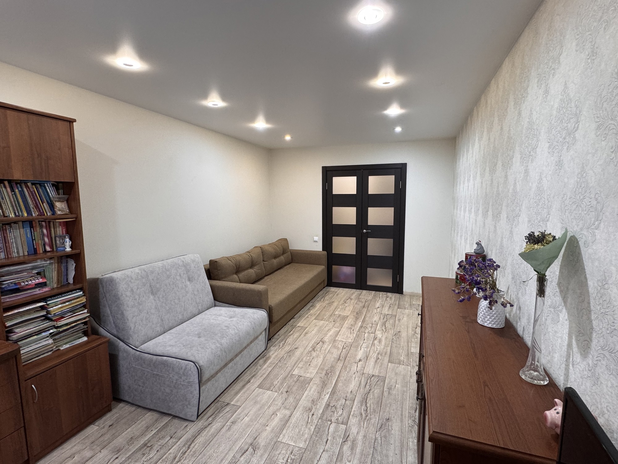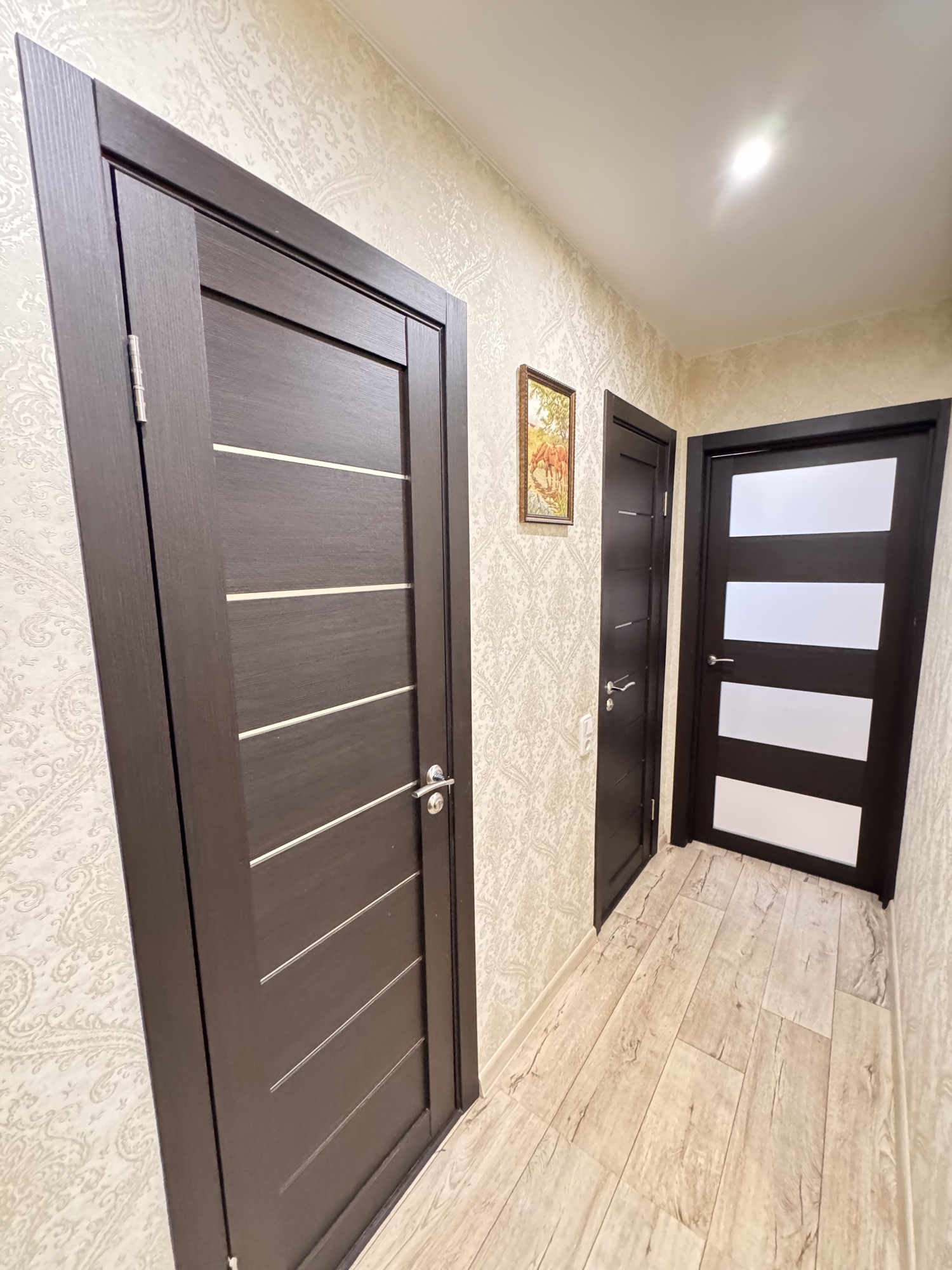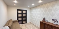 Состояние и ремонт: Отличное. Установлены стеклопакеты ПВХ (включая лоджию), металлическая входная дверь. Межкомнатные двери — шпонированные со стеклянными вставками. На полу выполнена стяжка, разведена полипропиленовая сантехника, стены выровнены, во всех помещениях смонтированы натяжные потолки.