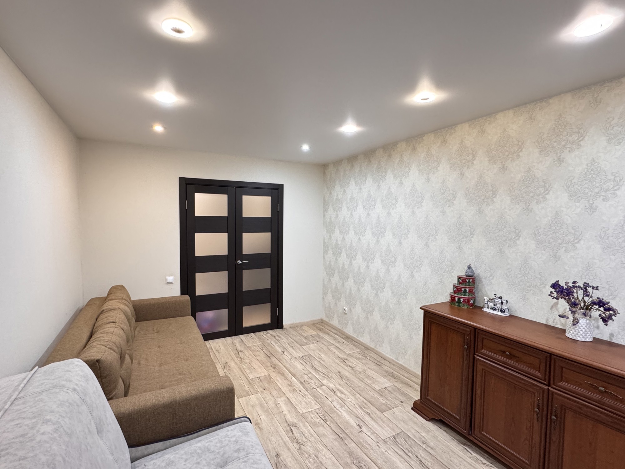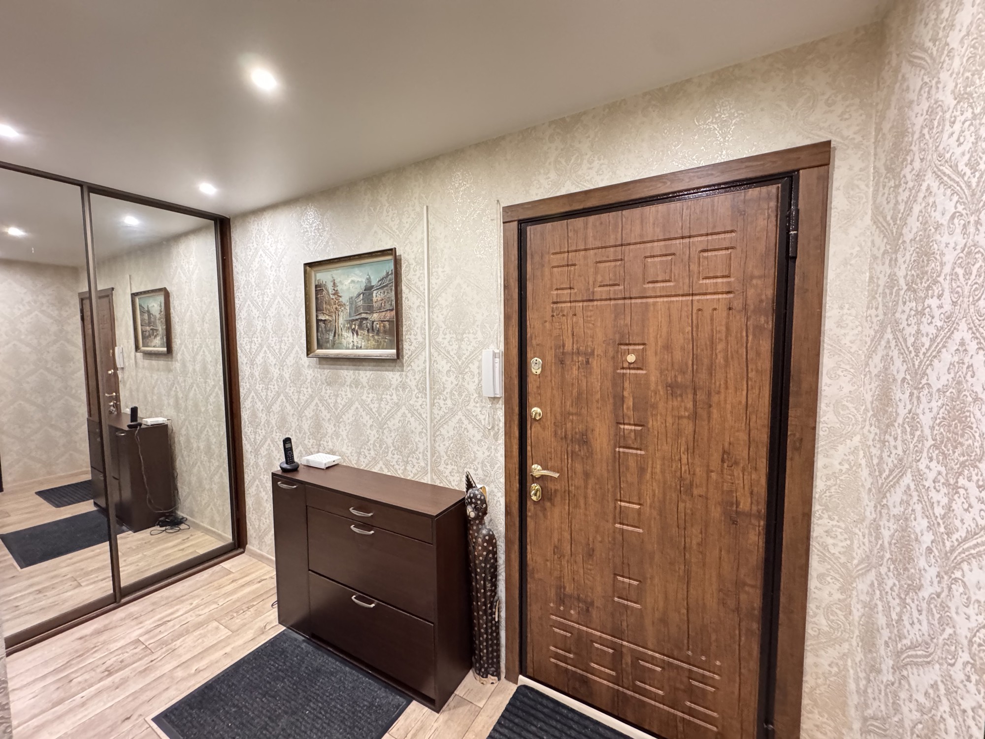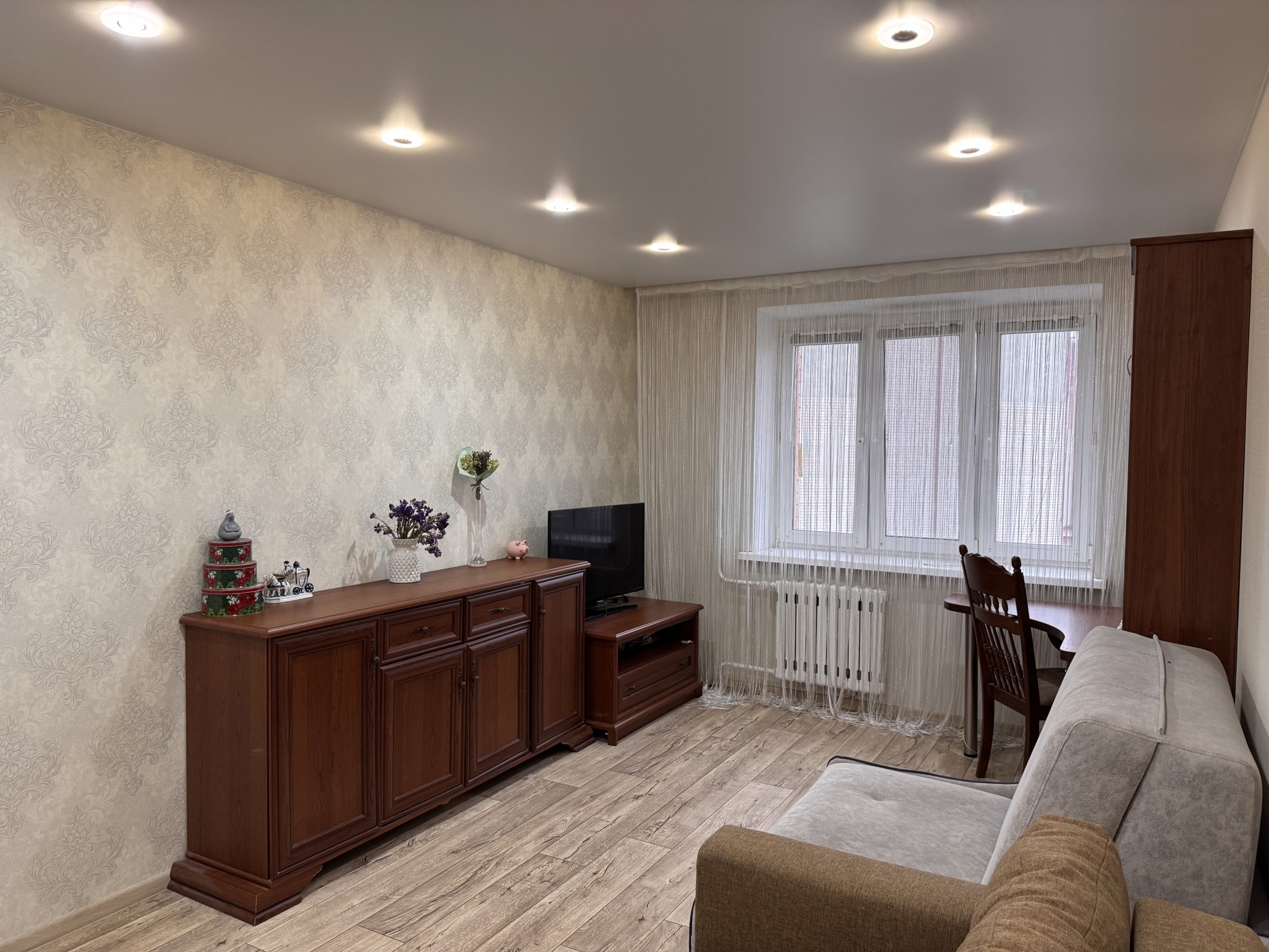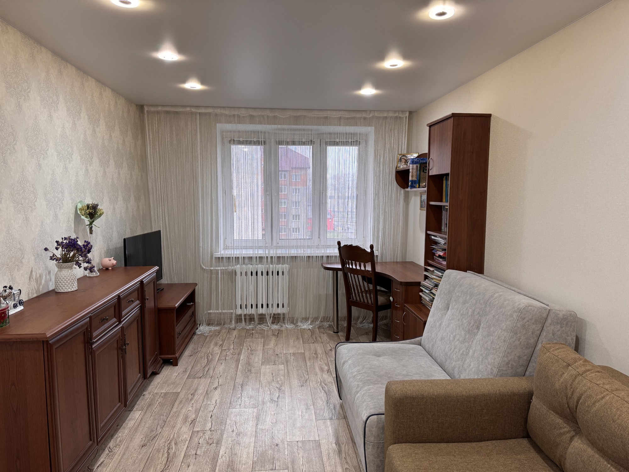 Состояние и ремонт: Отличное. Установлены стеклопакеты ПВХ (включая лоджию), металлическая входная дверь. Межкомнатные двери — шпонированные со стеклянными вставками. На полу выполнена стяжка, разведена полипропиленовая сантехника, стены выровнены, во всех помещениях смонтированы натяжные потолки.