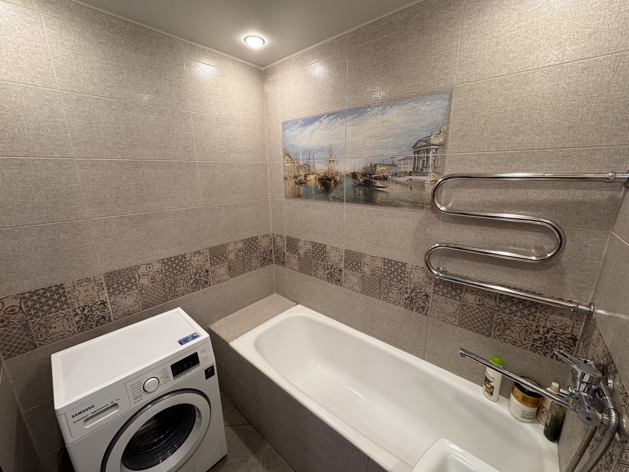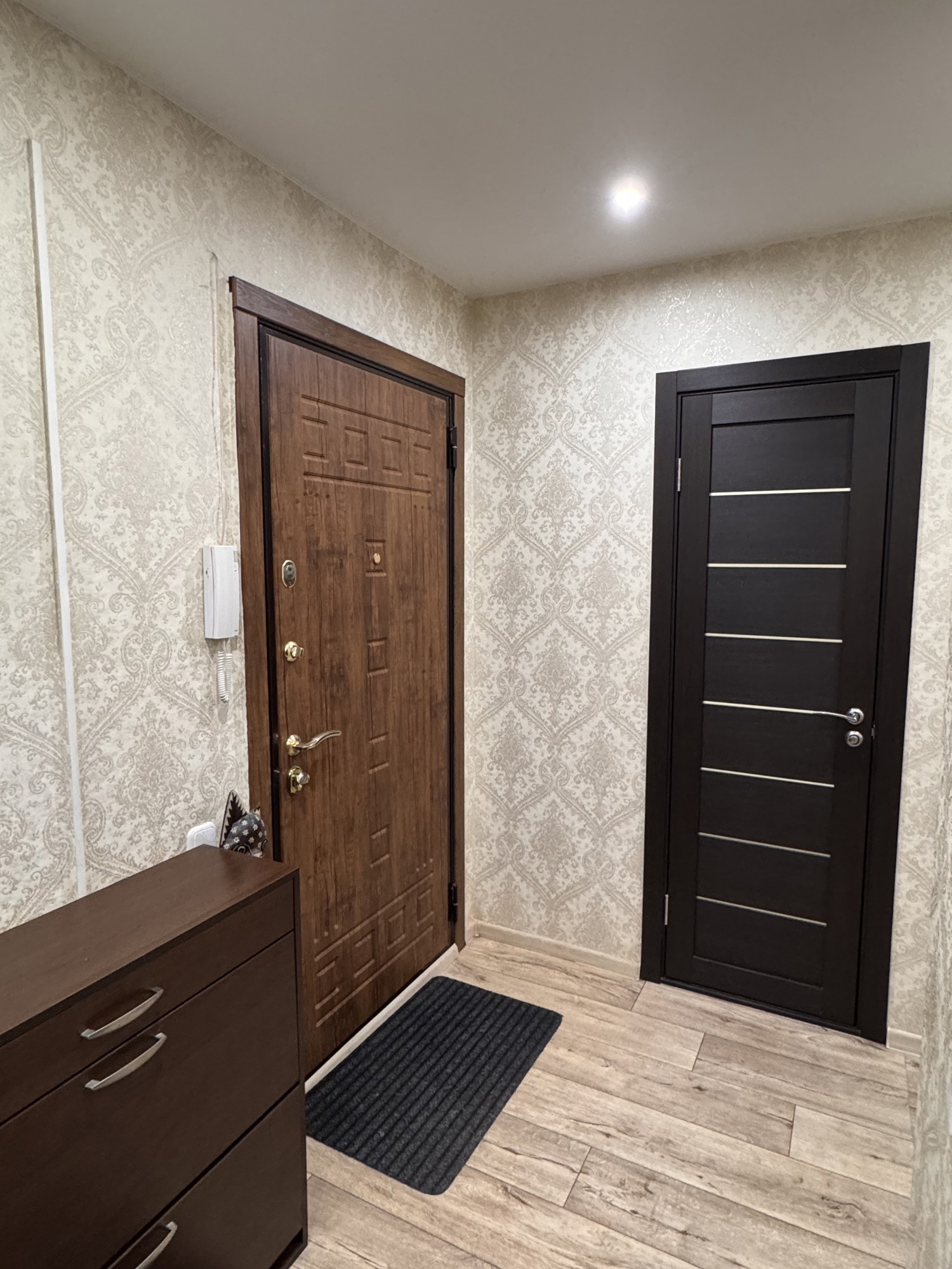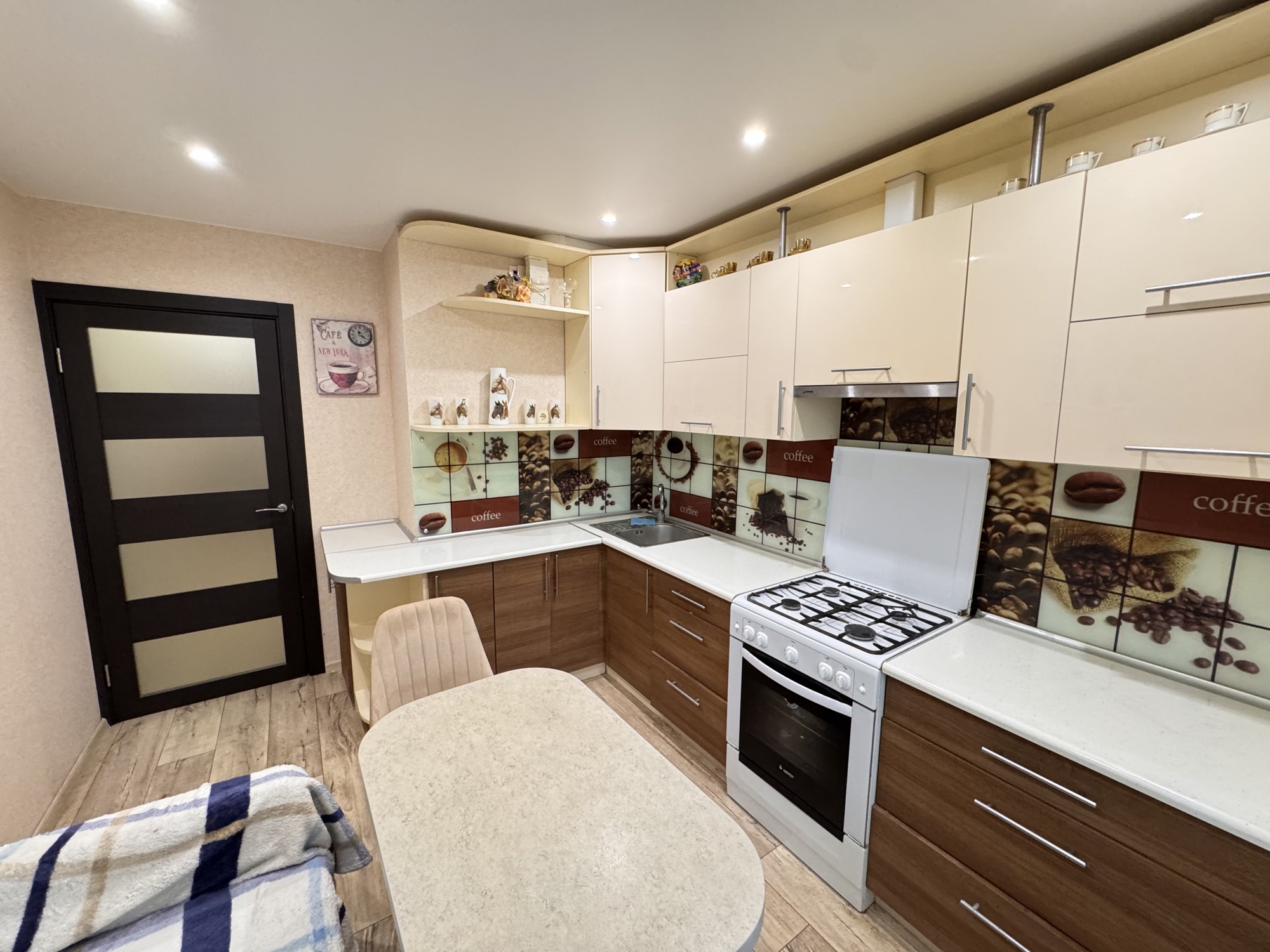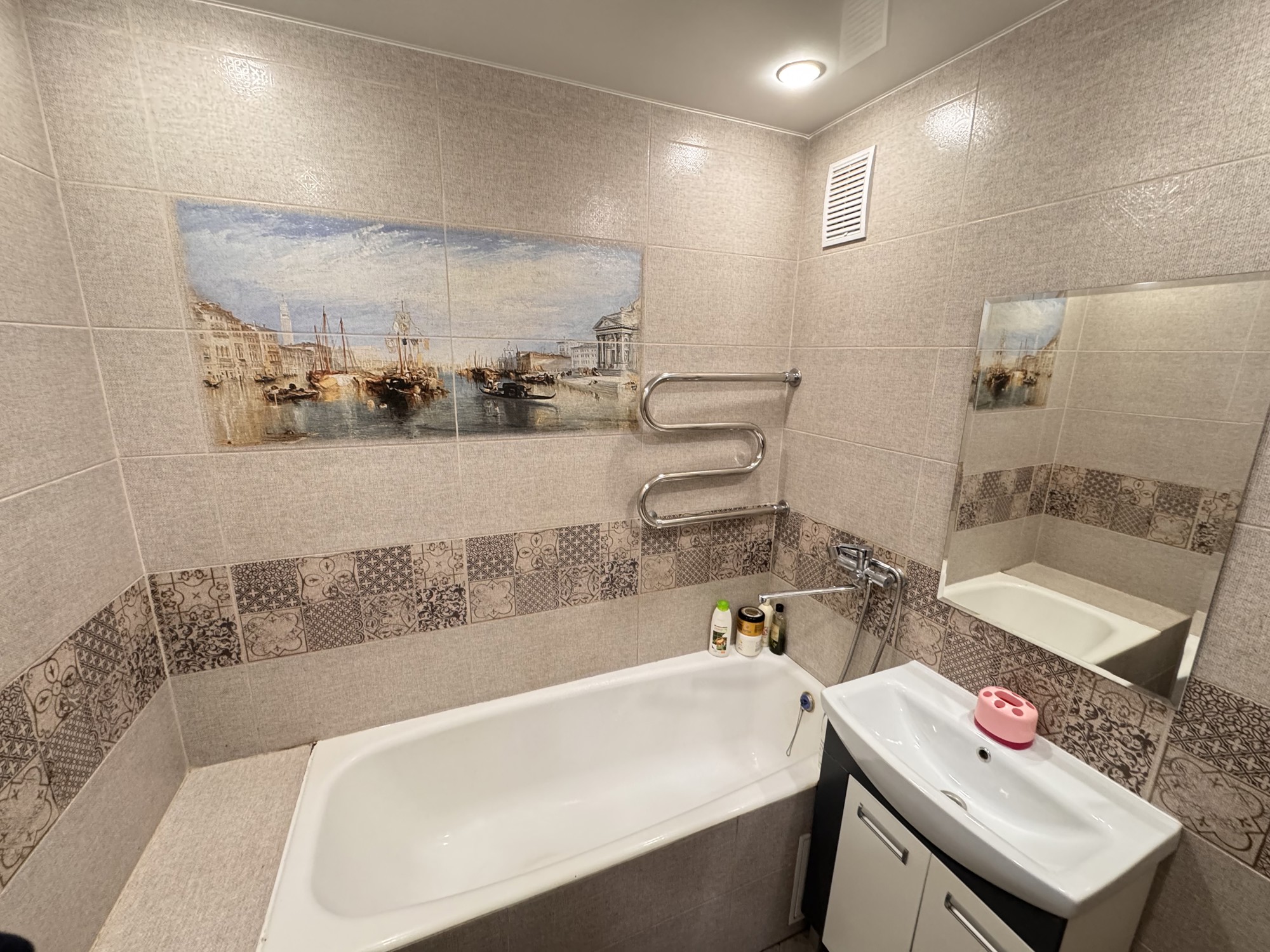 Состояние и ремонт: Отличное. Установлены стеклопакеты ПВХ (включая лоджию), металлическая входная дверь. Межкомнатные двери — шпонированные со стеклянными вставками. На полу выполнена стяжка, разведена полипропиленовая сантехника, стены выровнены, во всех помещениях смонтированы натяжные потолки.